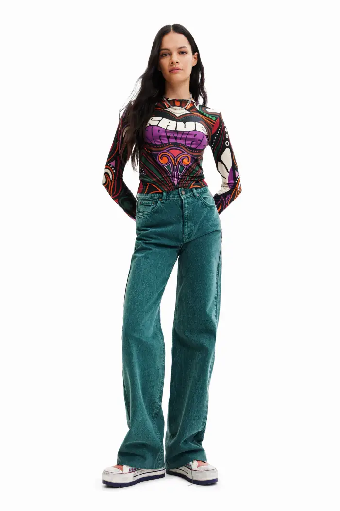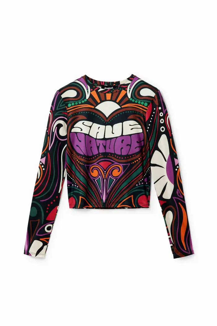 Maglietta elasticizzata a maniche lunghe aderente con stampa di messaggi e motivi in ââstile retrò GirocolloSalva la stampa della naturaVestibilità SlimManica lunga
