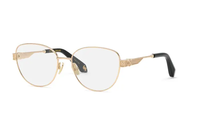 Gli occhiali da vista Roberto Cavalli VRC166M, con montatura a farfalla in metallo, offrono un design femminile e sofisticato Il colore oro dona un aspetto glamour.