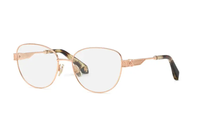 Gli occhiali da vista Roberto Cavalli VRC166M, con montatura a farfalla in metallo, offrono un design femminile e sofisticato Il colore oro dona un aspetto glamour.