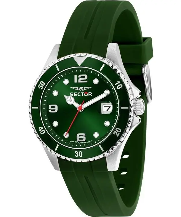 Sector 230 Cinturino in Silicone Quadrante Verde Quarzo R3251161055 100M Orologio da Uomo Caratteristiche Cassa in acciaio inossidabile Cinturino in silicone Movimento al quarzo Cristallo minerale Quadrante verde Display.