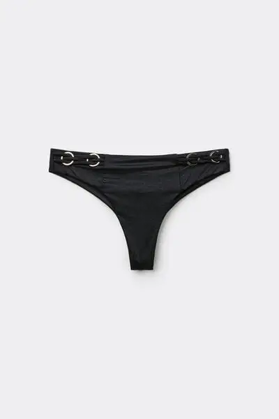 Bikini brasiliano realizzato in microfibra lucida con passamaneria con anelli dorati La cucitura posteriore conferisce una migliore vestibilità