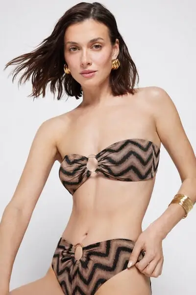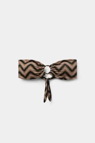 Bikini a fascia con coppe estraibili leggermente imbottite senza ferretto, con stampa chevron con filo lurex nero e sabbia e anello dorato nel centroseno Laccetto al collo removibile Le balenette laterali assicurano un buon sostegno e la chiusura è a fiocco sulla schiena