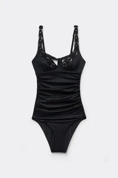 Costume intero realizzato in microfibra lucida con passamaneria con anelli dorati e coppe a triangolo leggermente imbottite Effetto leggermente arricciato sul corpo e sulle coppe, spalline regolabili e chiusura sulla schiena a fiocco Taglio sul retro a slip